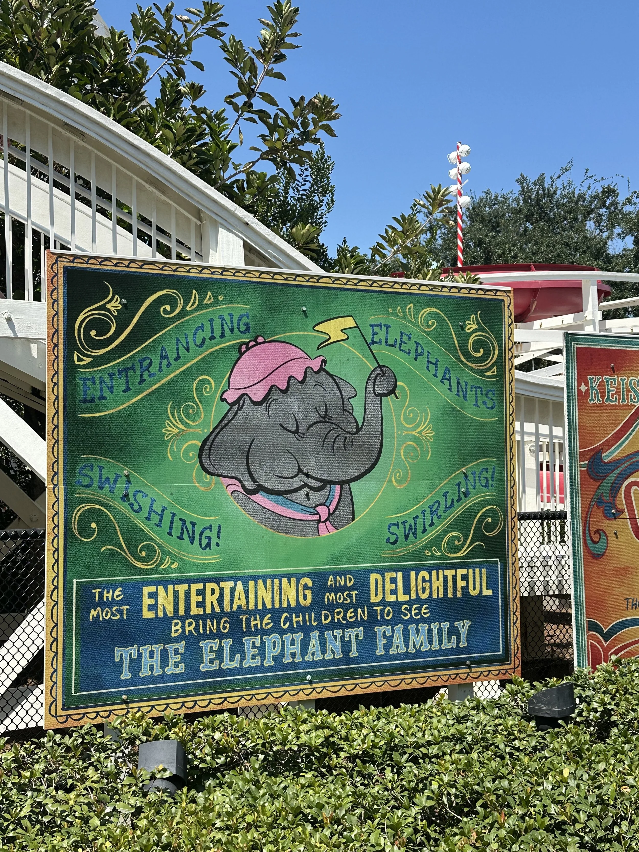 On the fence outside of the Keister Coaster at the main pool, you will find Mrs. Jumbo on a sign!