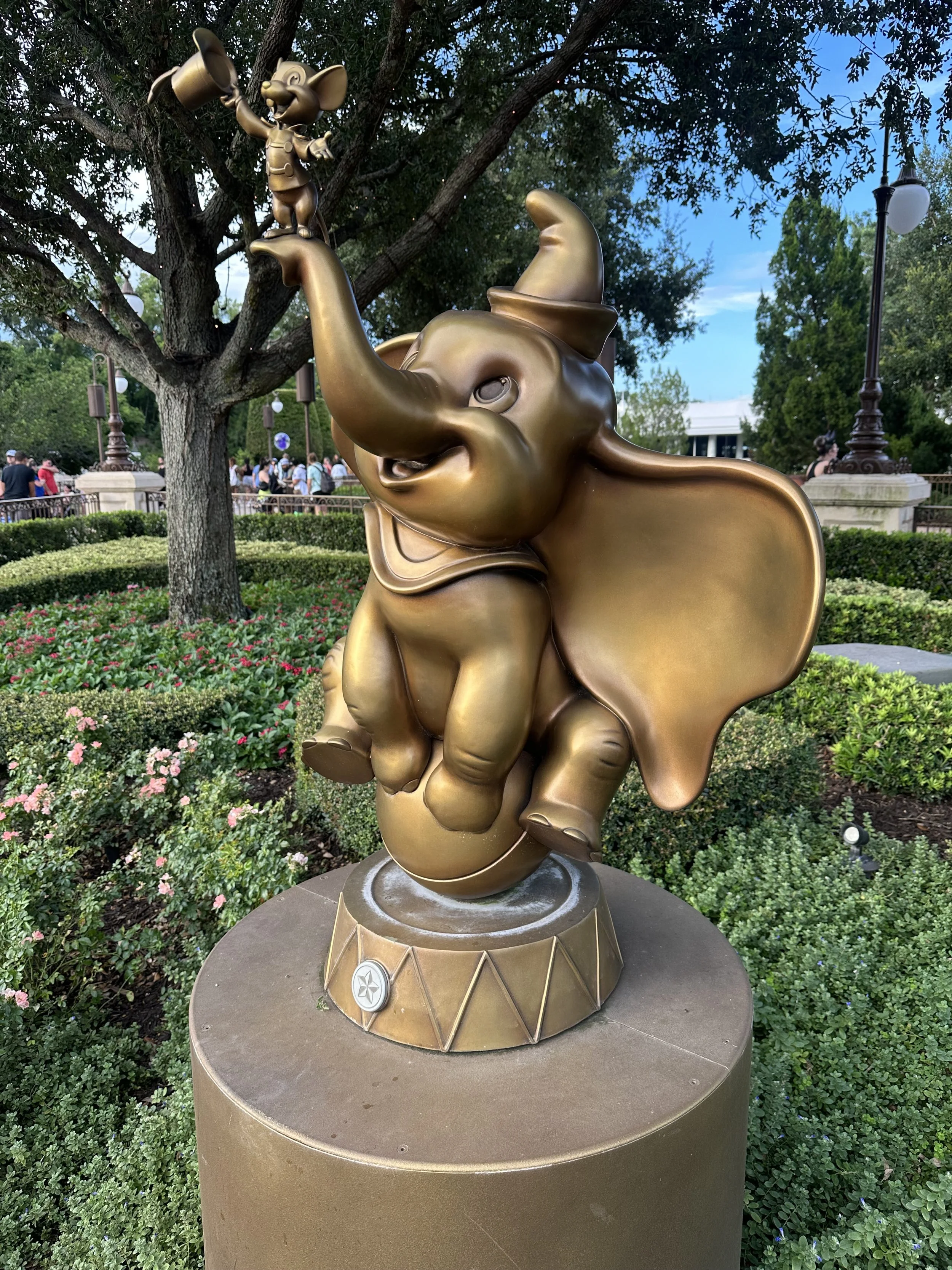 Look for Dumbo as part of the Disney Fab 50 Character Collection. His golden statue is located near the Hub. If you're wearing a MagicBand+, be sure to interact with the statue for a bit of extra magic.