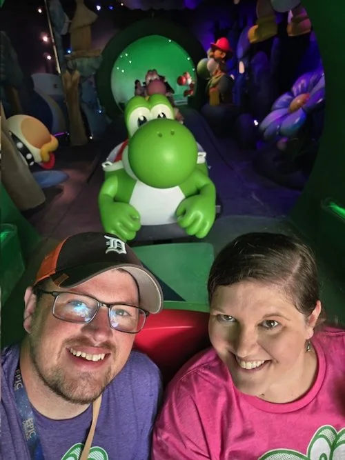 Bowser’s Challenge was fun, but I honestly would’ve preferred it without the VR headset. They built beautiful real-life sets, and I wish I could’ve appreciated them more. So many rides use screens now and skip the physical charm. Afterward, we checked back on Mine Cart Madness, still down, but Yoshi’s Adventure was open and I was thrilled. It's a gentle ride, Universal’s version of the Disney PeopleMover, and since Yoshi is always my go-to character in Mario Party or Mario Kart, it was a personal highlight.