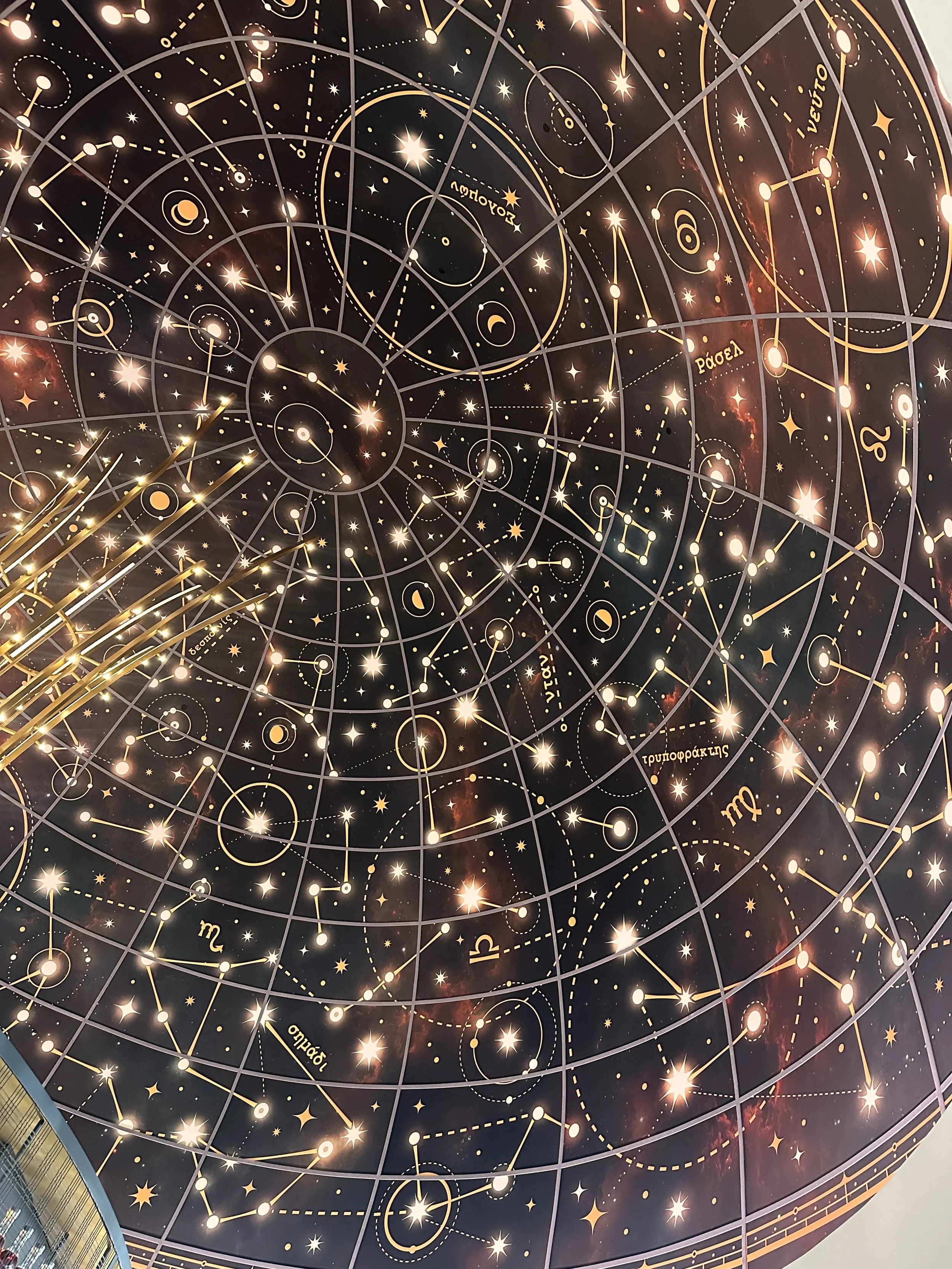 Bar Helios serves mostly small plates and tapas-style dishes, but I still left feeling pretty full. The whole restaurant leans into a celestial and zodiac theme, with gold accents and moody, elegant décor. The space is divided into three areas: the bar, the dining room, and outdoor seating.